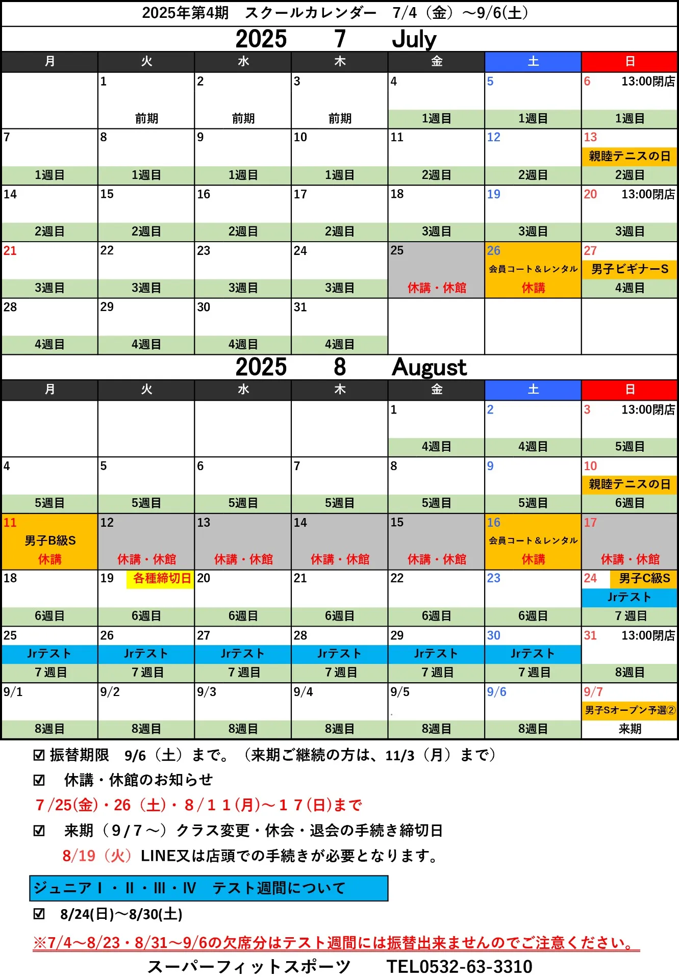 ✅【日程調整の為スクール休講】 7/25(金)・26(土)・8/11(月)~8/17(日)