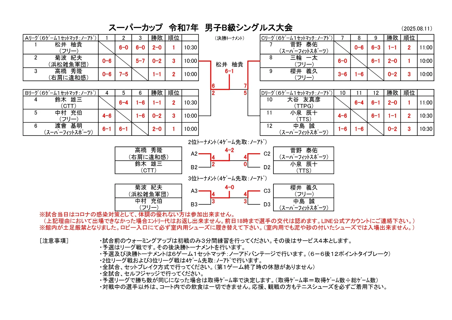 【試合結果】8/11(月・祝)男子B級シングルス