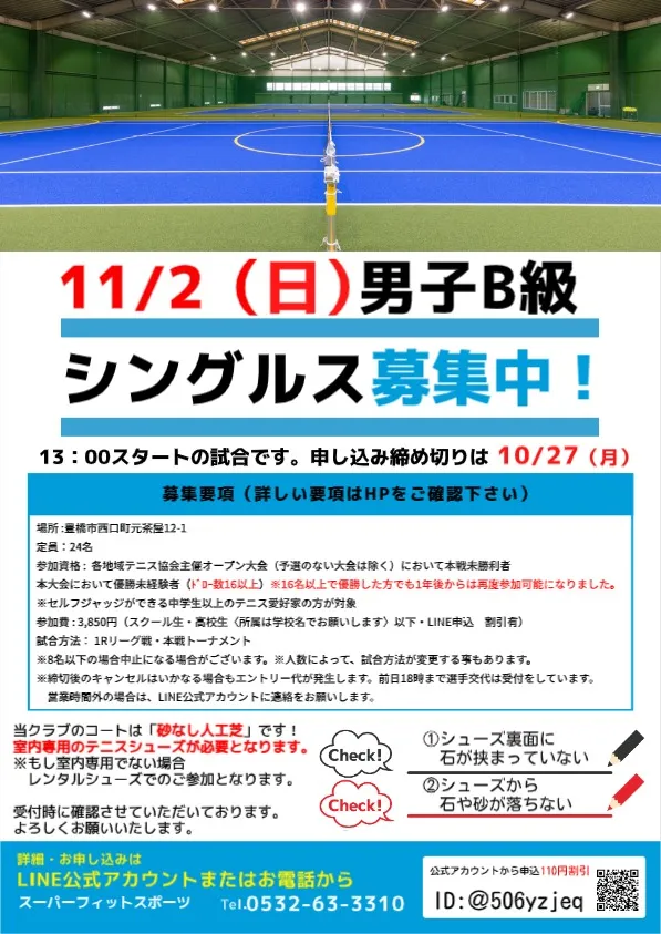 シューズの裏面に石や砂がついていないか、シューズから砂が落ちないか受付時に確認させていただいております。砂が落ちるシューズの場合、レンタルシューズでのご参加をお願いしております。