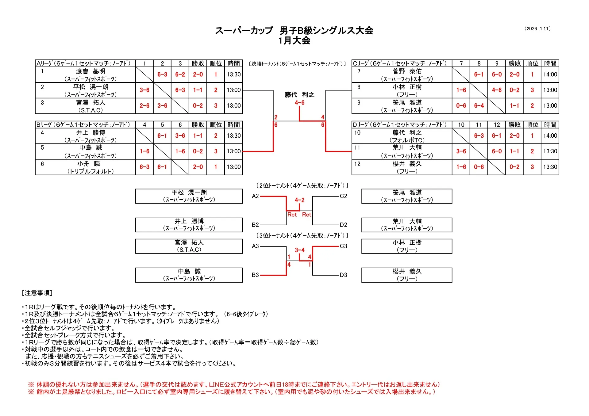 【試合結果】1/11(日)男子B級シングルス大会